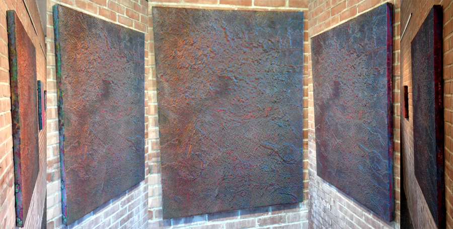I’m most drawn to the largest painting in the show, a painting whose colors are brass and blue. If I start to the left of the painting I see a field of gold and reddish hues in the center of the canvas. As I move to the right, the center loses its distinction, the reds drip downward, and thin waves of blue begin to rise along the ridges of paint. Finally I come to the far right, and the brass is almost wholly subdued. A few sparks of red remain, but the blue has imposed a kind of silence. To sit before this painting is to commune with something beyond yourself. I know that it’s only paint, and mud, and clay, and plaster. But it seems alive. More than that, it announces the life of its materials, and points beyond them to all physical objects. It suggests that the whole world is alive – the buckled glass on the chapel door, the pattern of shadow on the weathered maple tree outside the window, the perpendicular grooves on the column of the lamp post beside it. And if these things are alive, they have their own kinespheres, their own zones of energy and being, that subtly change and alter, grow and dwindle, depending on our interactions with them.